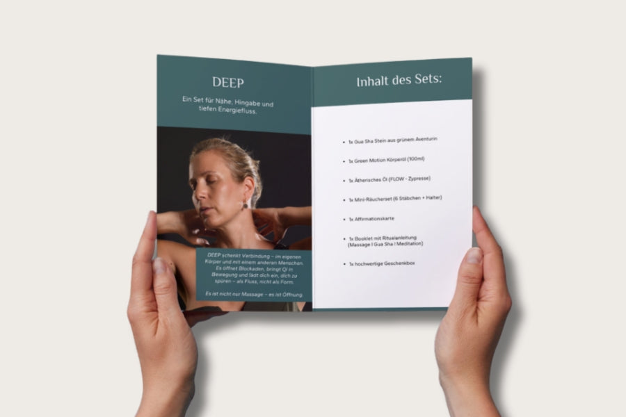 Das Deep-Booklet führt dich Schritt für Schritt durch das Ritual - inklusive Erklärung der wichtigsten Meridiane, Playlist zum Entspannen und von Dr. Thomas Peter gesprochener Meditation. Du kannst dich auf ein ganz besonderes Erlebnis freuen.